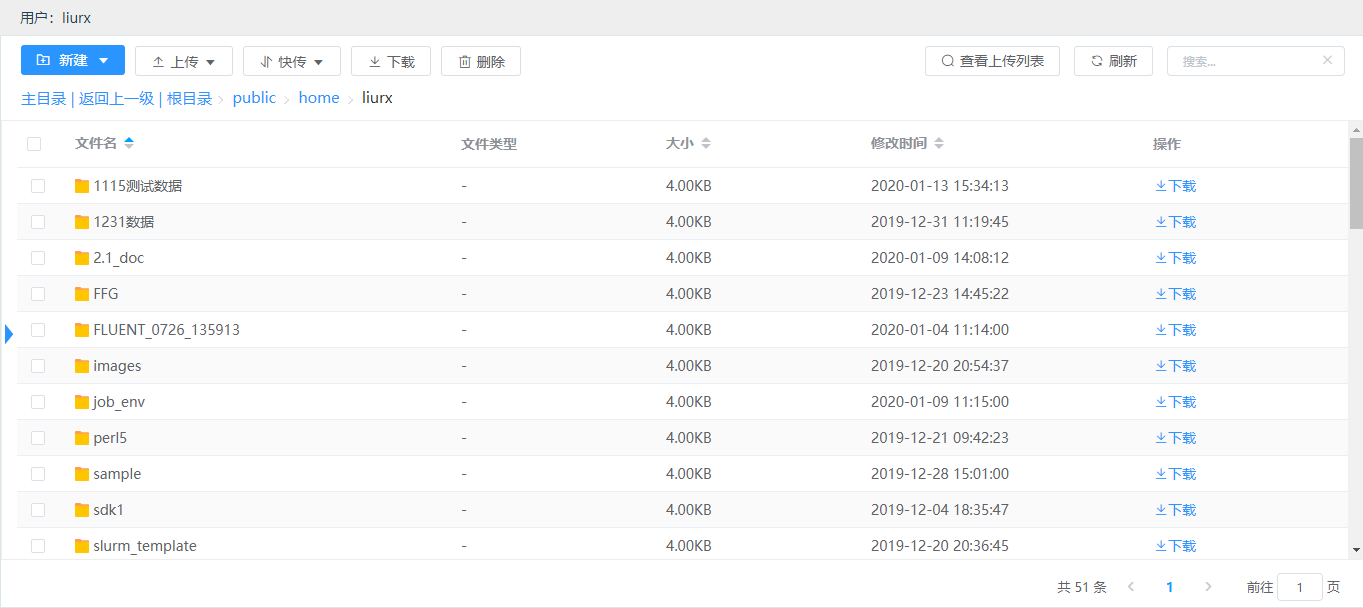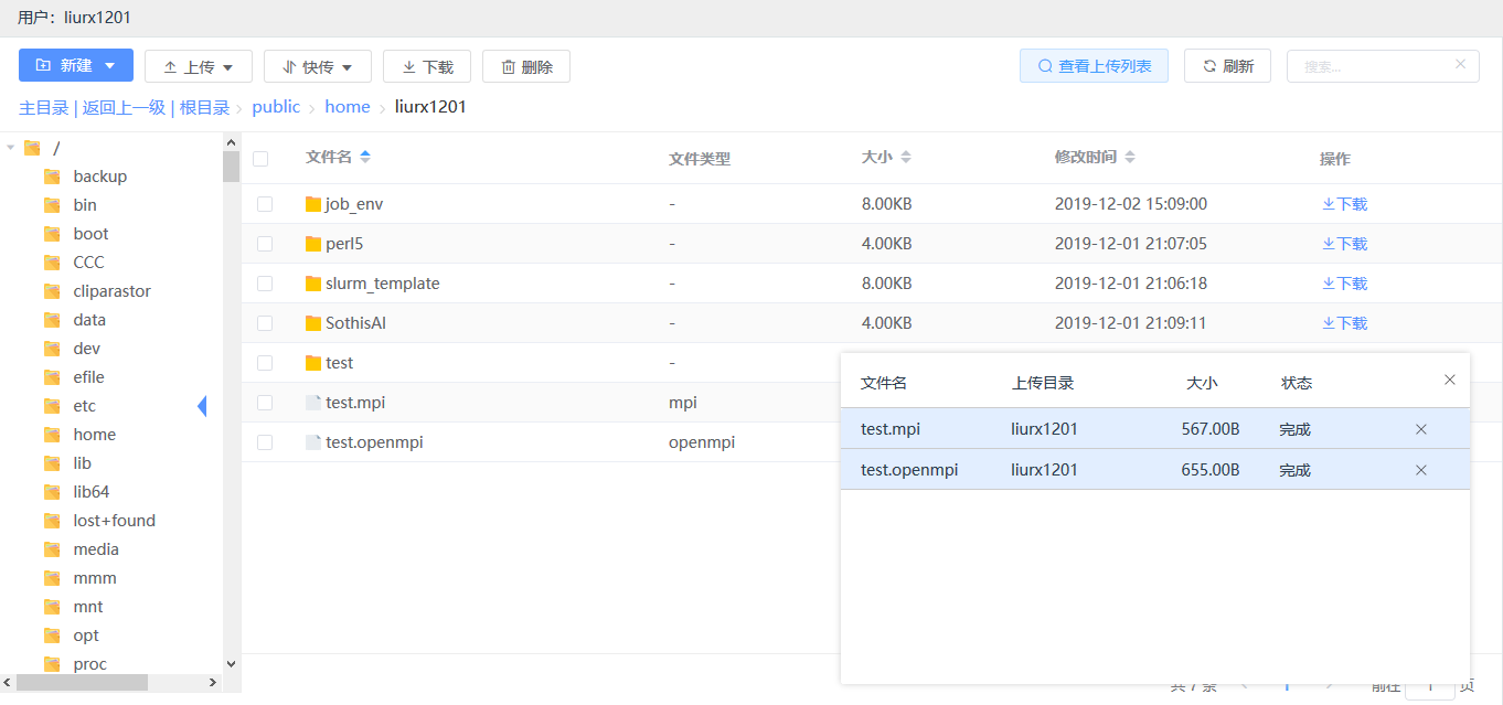 上传小文件可以使用“上传”,点击,页面会显示本次上传的文件。