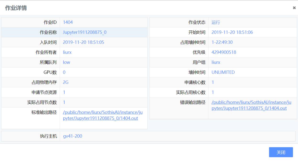 点击一条作业可查看作业详情,对运行或已完成的作业可以点击日志路径实时预览日志。